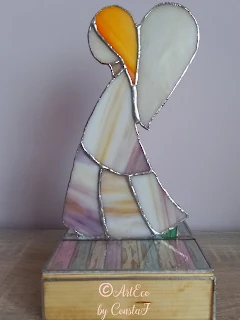 Dimensiuni: H înger =26 cm (31,5 cm totală), baza lemn 15,5 x 15,5 x 4,5, realizat din sticlă specială prin tehnica vitraliilor și bandă anti alunecare la baza lemnului.